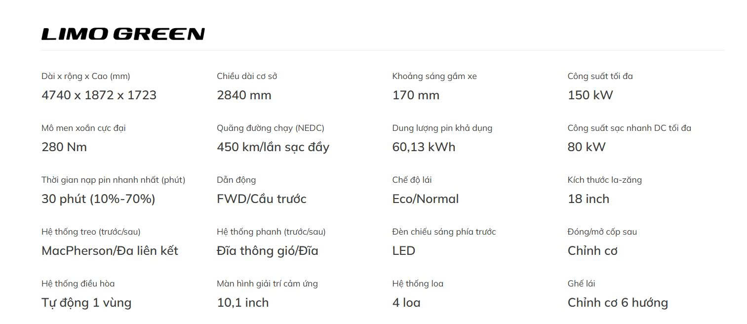 VinFast Limo Green được trang bị mô tơ điện mạnh mẽ với công suất 201 mã lực và mô-men xoắn 280 Nm, dẫn động cầu trước. Tầm hoạt động của xe lên đến 450 km sau mỗi lần sạc, giúp người dùng tự tin trong những chuyến đi xa. Thời gian sạc từ 10-70% pin chỉ trong 30 phút mang lại sự tiện lợi cho người sử dụng.